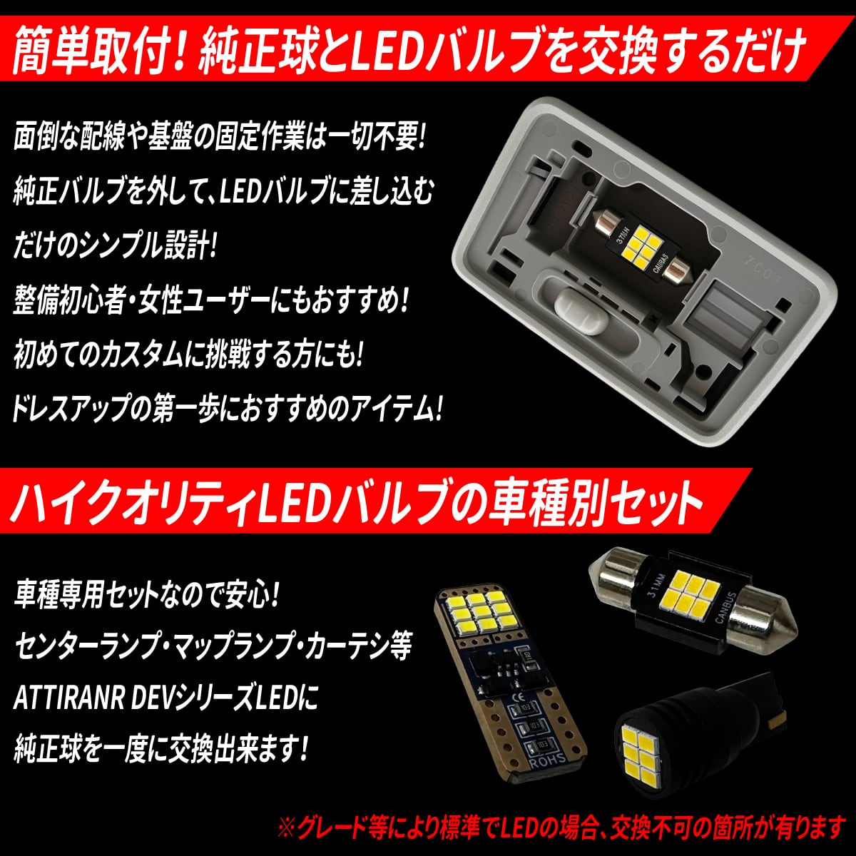 純正バルブを外して、LEDバルブに差し込むだけのシンプル設計