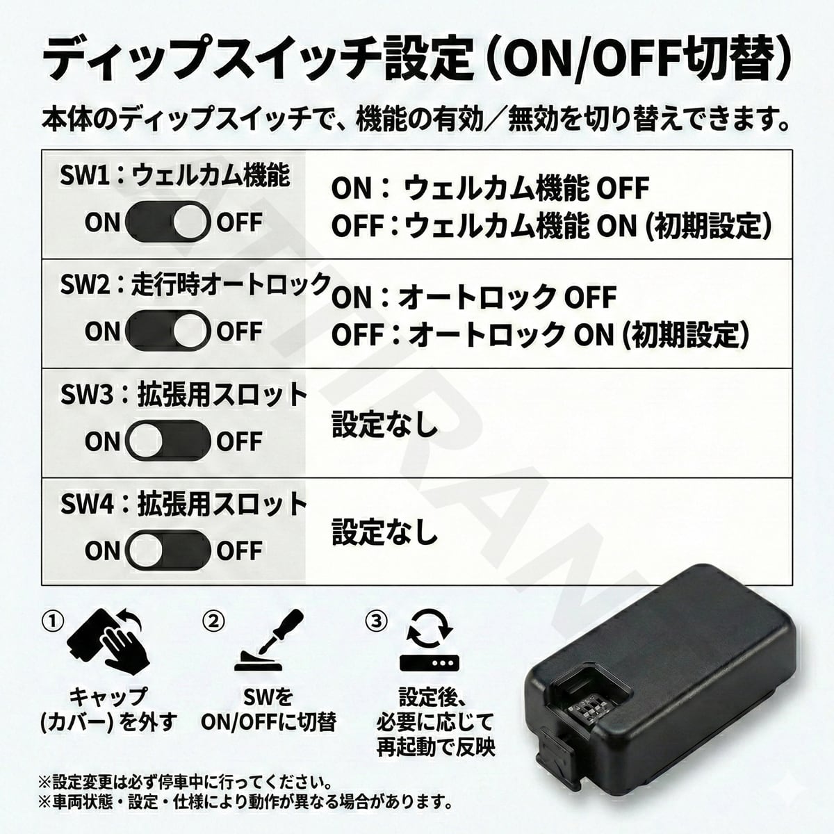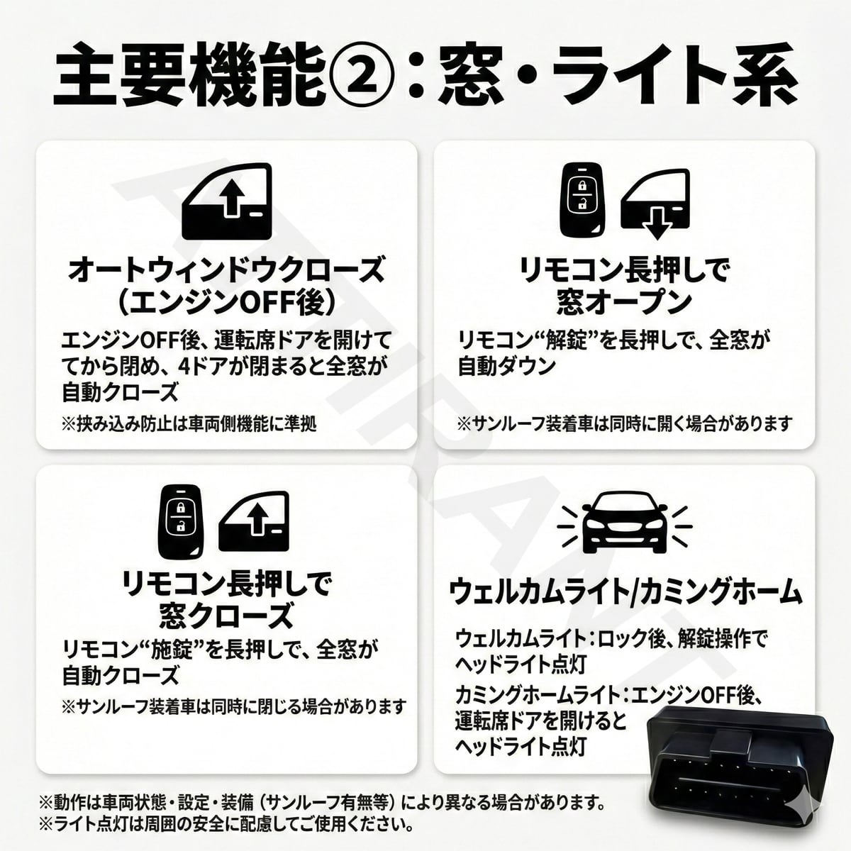 ※動作不安定時:車両個体差で窓が閉まらない場合は、純正リモコン長押し機能をご使用下さい。