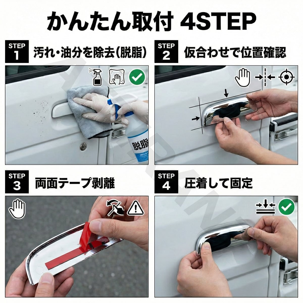 ※貼り付け前は必ず脱脂作業を行ってください(洗剤・パーツクリーナー等で清掃後、十分に乾燥)