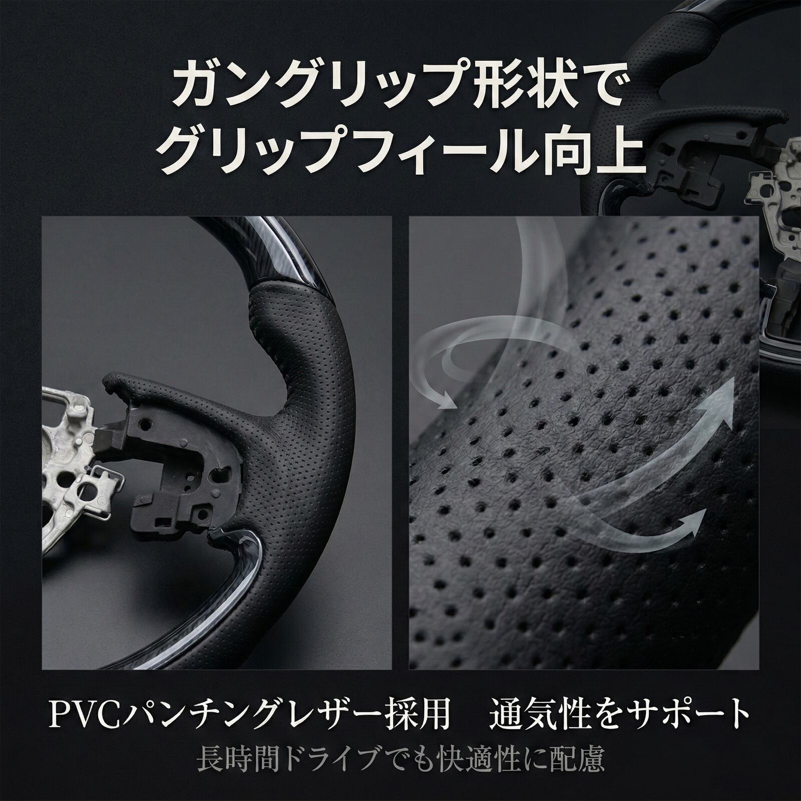 純正ステアリングの機能をそのまま活かしながら、握り心地と質感を大幅に向上させる 専用設計ステアリングホイール。