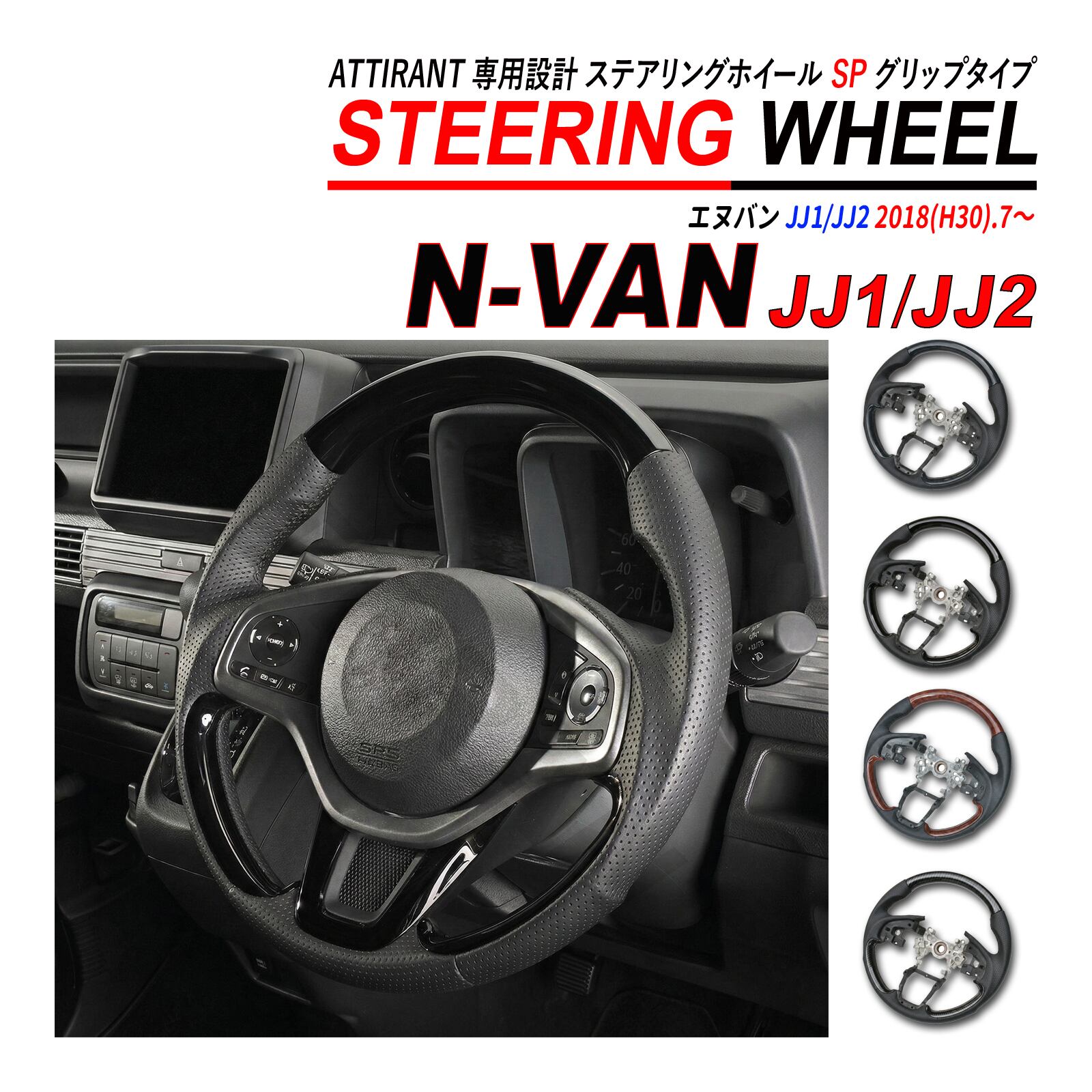 N-VAN JJ1 JJ2 ガングリップ スポーツステアリング ハンドル パンチングレザー ピアノブラック カーボン調 茶木目 黒木目 純正エアバッグ移植