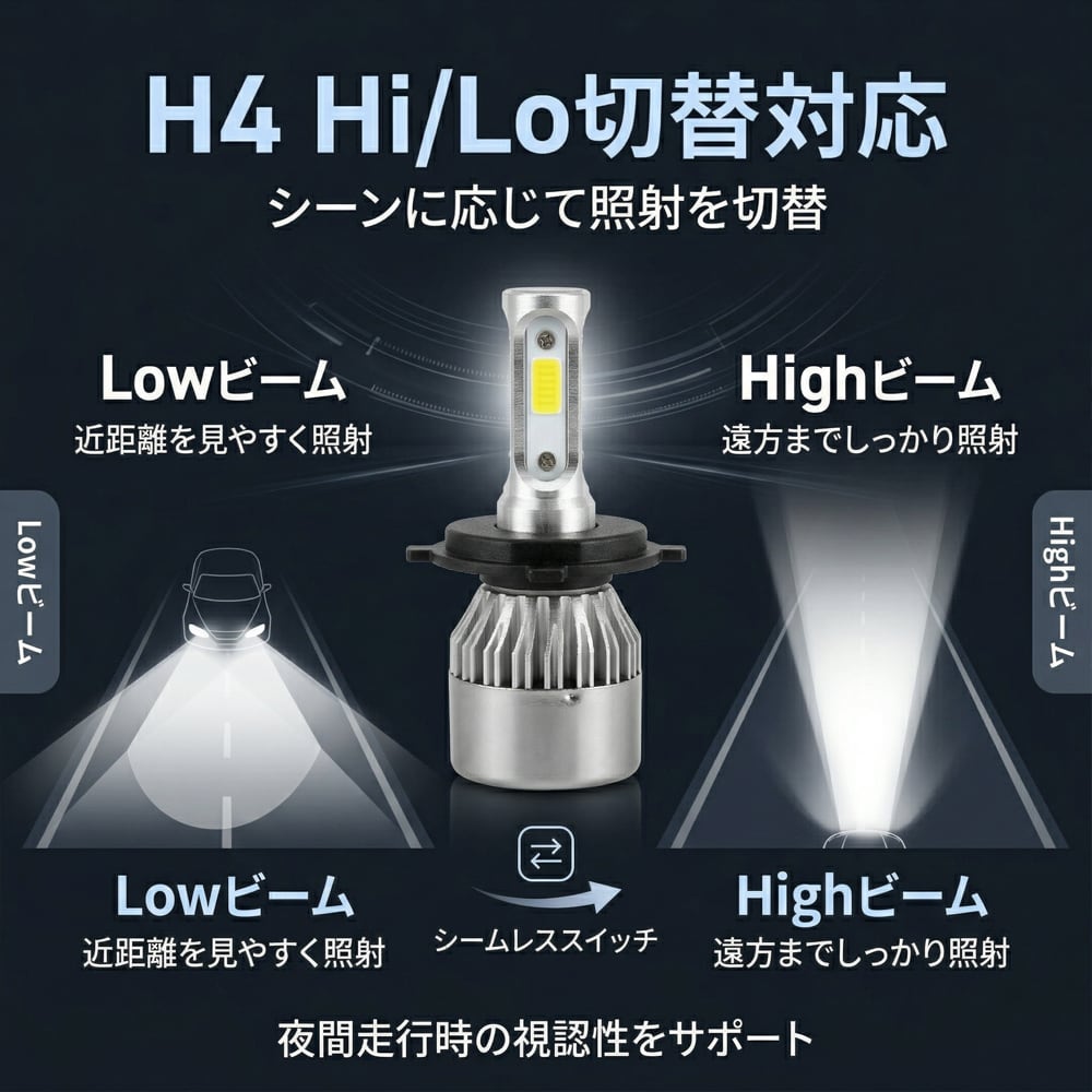 H4規格対応のHi/Lo切替式LEDヘッドライトバルブです。