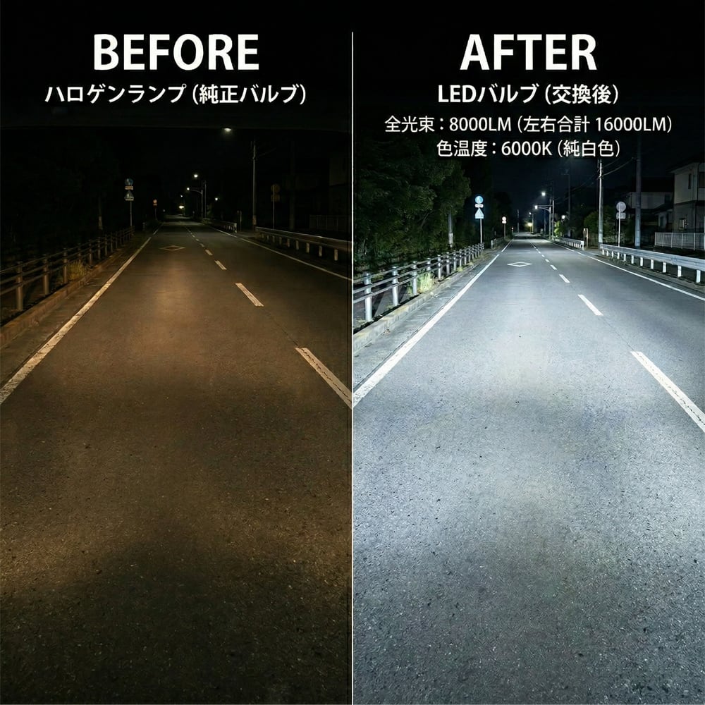 左右合計16000LMの高輝度設計と、6000Kのクリアな純白光により、夜間走行時の前方視認性をしっかりサポートします。