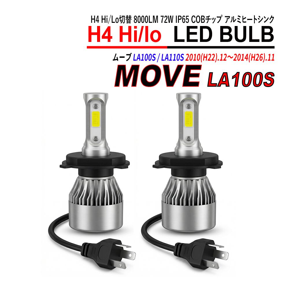 ムーヴ LA100S LA110S H4 LED ヘッドライト バルブ Hi/Lo切替 6000K 左右合計16000LM 72W IP65 COBチップ アルミヒートシンク 2本セット